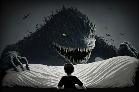 nightmare concept showing a boy on bed facing giant monster in the dark land , digital art style, illustration painting, fantasy concept of a boy on bed near the giant monster