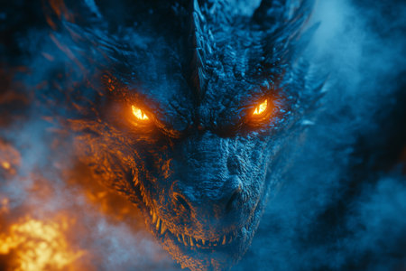 Cinematic close up of an angry dark blue dragon with glowing eyes in a foggy fantasy setting