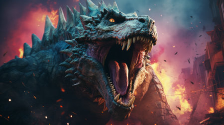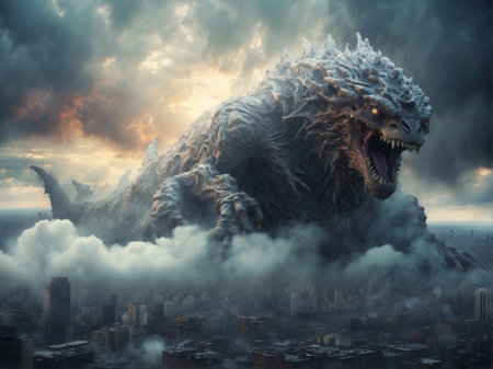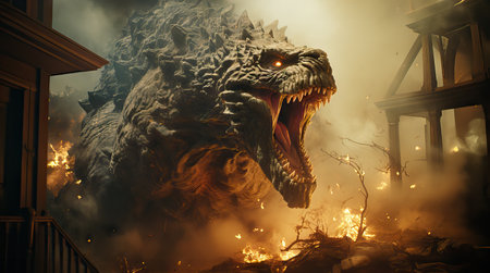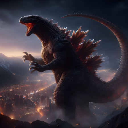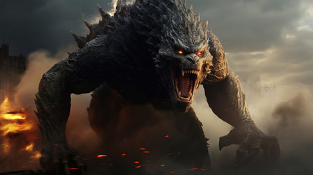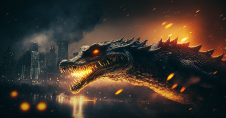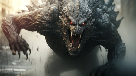godzilla, the king of monsters, charges towards the camera with intense ferocity, its massive size and ultra-realistic details evoking a sense of fear and awe, as if it's about to burst out of the screen, bringing destruction and chaos to the cityscape. ai generated