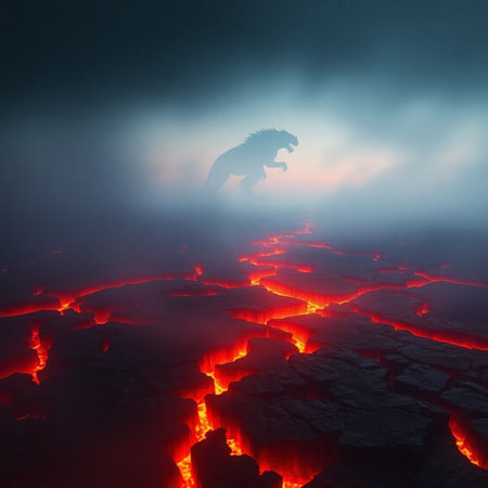 A giant monster stands atop a lava field, surrounded by molten rock and burning embers