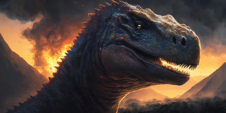 A massive dinosaur stands amidst flames and smoke, showing a background of destruction.