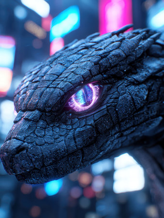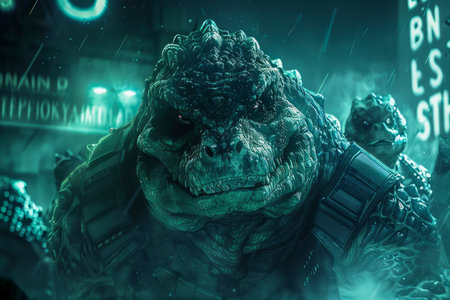 Futuristic Cyberpunk City with Imposing Anthropomorphic Reptilian Creature in Rainy Ambiance AI Generative