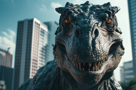 Huge dinosaur predator in a modern city with multi-storey buildings