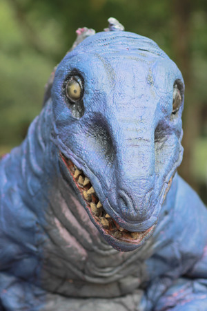 A detailed close-up of a blue dinosaur with textured skin and glowing purple eyes, set against a vibrant, colorful backdrop.
