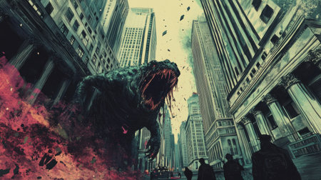 A post-apocalyptic cityscape with a giant mutated monster attacking the remains of the city. Fantasy concept, Illustration painting. Generative AI