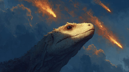 A giant lizard watches comets streak through a twilight sky full of clouds.