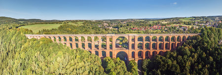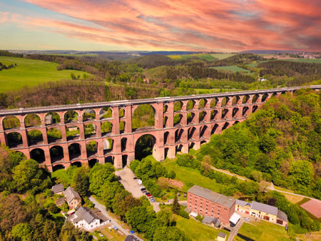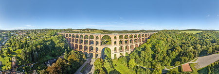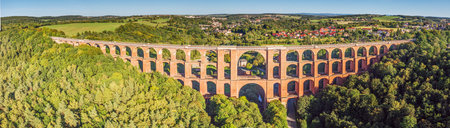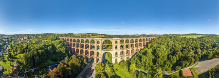 Aerial view of the Goeltzschtal Bridge near Reichenbach in Vogtland surrounded by green landscape and village scenery