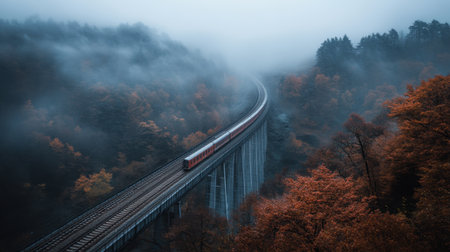 A captivating red train gracefully traverses a misty bridge, enveloped by vibrant autumn foliage. This serene landscape showcases the beauty of nature in transition, evoking a sense of tranquility and adventure.
