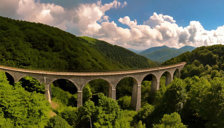 The historic Zampach stone railway bridge arches gracefully over a lush forest, showcasing its impressive stonework and connecting the rail tracks to the verdant landscape below.