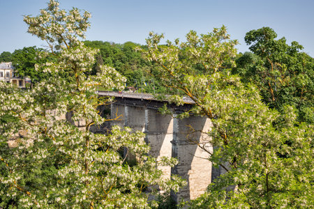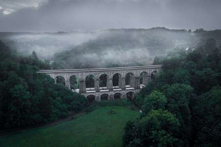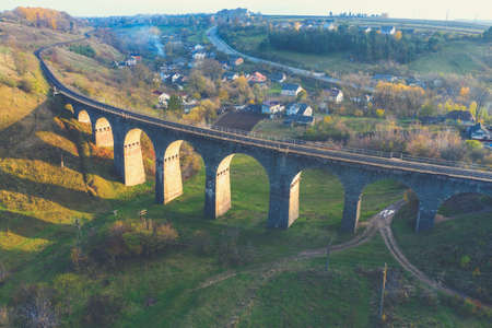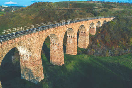 Old Arched Stone Railroad Viaduct Bridge. Plebanivka, Ternopil Oblast, Ukraine, Europe. View from above
