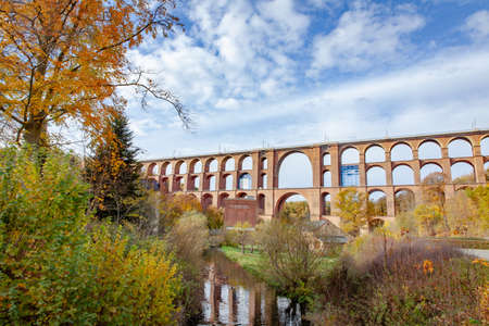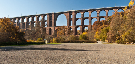 Goltzschtalbrucke - wold largest brick bridge near Plauen city in Saxony with colorful autumn trees and clear sky