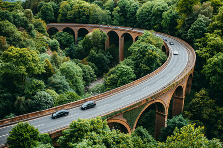 Cars travel along a curved bridge, seamlessly integrated within a dense forest. The surrounding greenery creates a vibrant, scenic backdrop, showing nature's beauty in full bloom..