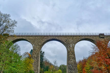 detail of Elstertalbrucke brick bridge with colorful autumn forest on the background and clear sky near Plauen city