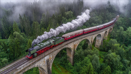A classic steam train traverses a stone arch bridge, surrounded by dense green forest and a misty atmosphere. The locomotive emits thick white smoke against a backdrop of trees, creating a scenic view. This image could be used for travel, historical, or transportation-related projects and publications.