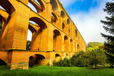 Germany. The Goltzsch Viaduct is the largest red brick viaduct in the world. Sunny cold morning in October. Magnificent huge bridge in a beautiful green park.