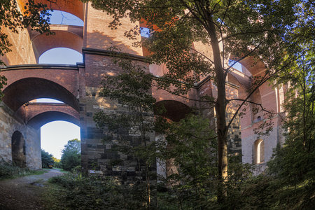 Perspective from below the Goeltzschtal Bridge in Vogtland Germany with massive brick arches and forest path
