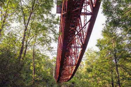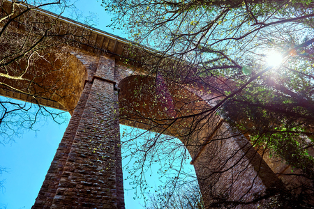 Perspective from below the Goeltzschtal Bridge in Vogtland Germany with massive brick arches and forest path