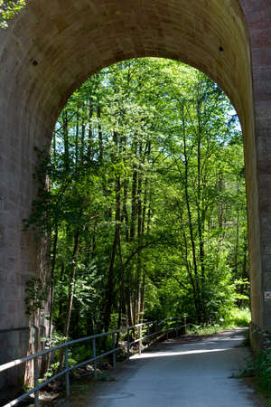 old arch Bridge railway viaduct between hills in the green Forest Germany trees