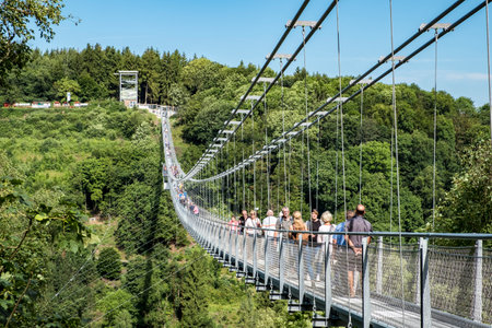 HARZ, GERMANY - JULY 29, 2017: In 2017 completed Harz Rappodetalsperre suspension bridge in East Germany attracts the visitors.