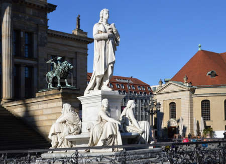 BERLIN, GERMANY - CIRCA JUNE 2016: Friedrich Schiller monument in front of Konzerthaus Berlin concert hall on the Gendarmenmarkt square in central Mitte district in black and white
