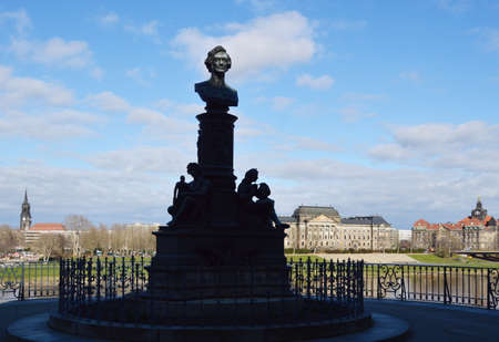 Ernst Friedrich August Rietschel statue detail symbolizing drawing. Bronze sculpture of sitting man and Cathedral of the Holy Trinity or Hofkirche on the background. Landmarks of Dresden, Germany