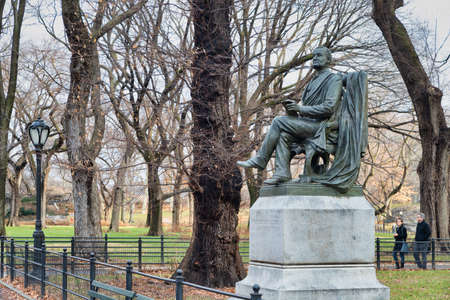 Fitz Greene Halleck Statue (by James Wilson Alexander MacDonald) in Central park New York city daylight view with trees and clouds in sky
