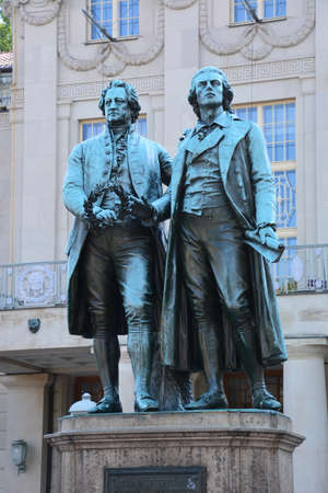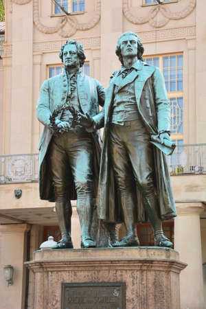 Goethe Schiller Memorial in Weimar. The Goethe Schiller monument designed in 1857 by what Ernst Friedrich August Rietschel. The bronze double statue is one of the most famous and most beloved monuments in all of Germany.