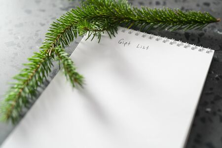 Preparation of Christmas gifts. Gift boxes are packed with kraft paper decored branches fir. to-do list for winter holidays. Xmas background. Still decor. Natural ornament. Top view