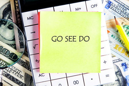 A sticky note reads GO SEE DO on a calculator. Money in United States currency, a magnifying glass, and a yellow pencil are also visible.
