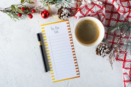 Cup of coffee, holiday decorations and paper to do list on white table top view, Christmas planning concept. Flat lay style. Happy new year.