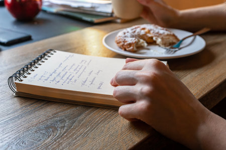 Hand with paper note pad at cafe table, wooden desk, writing plans, setting goals in planner, notepad, organizer. high quality photo