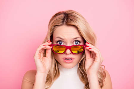 Funny young woman is looking over the sunglasses on a yellow background. Optics, sunglasses.