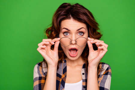Close-up portrait of her she nice lovely winsome pretty attractive cheerful amazed wavy-haired girl wearing checked shirt putting off glasses isolated on bright vivid shine green background