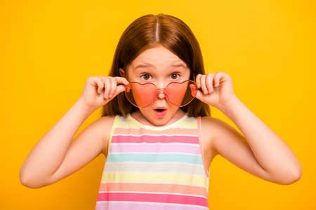 Close up photo of astonished girl touching her specs wearing singlet isolated over yellow background