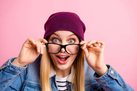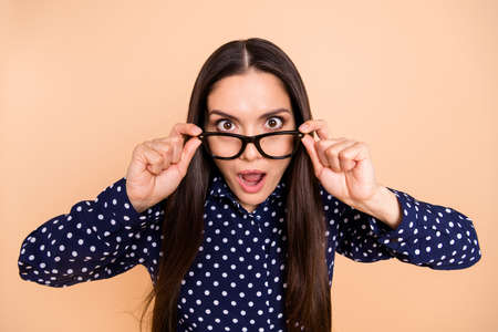 Portrait of shocked lady hands hold glasses open mouth staring camera isolated on beige color background