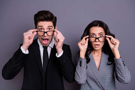 Close-up portrait of nice attractive stylish smart clever intelligent terrified partners finance experts touching specs horror emotion expression isolated on gray violet purple pastel background