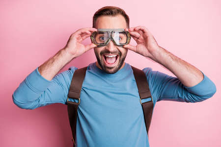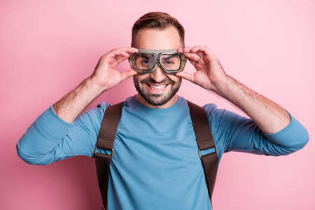 Photo of handsome cute young guy wear blue pullover arms glasses backpack ready to skydive isolated pink color background