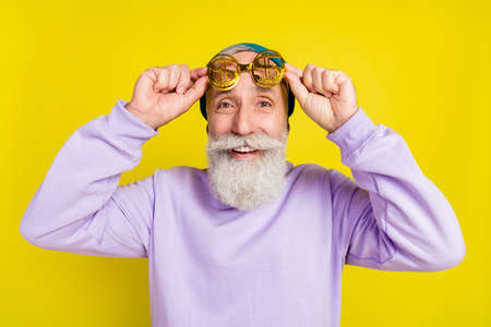 Photo of funky positive mature man dressed purple pullover headwear arms eyewear smiling isolated yellow color background