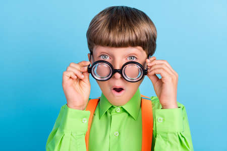 Portrait of attractive brainy amazed schoolboy nerd touching specs wow isolated over teal turquoise color background
