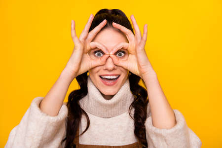 Back to childhood concept. Close up photo of funny funky hipster lady show ok sign make binoculars from fingers look with tongue out have fun fooling, wear red sweater isolated yellow color background