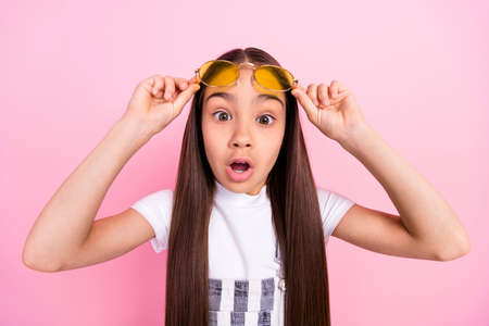 Photo of amazed shocked young small girl wear sunglass news sale reaction isolated on pink color background