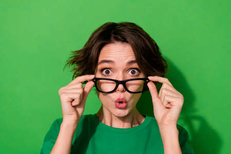 Photo of funny shocked woman dressed summer t-shirt arms eyewear big eyes isolated green color background