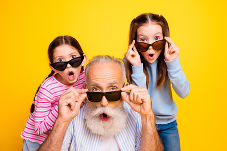 Elderly man and two young girls wearing sunglasses in a playful pose, set against a vibrant yellow background