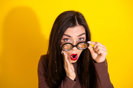 Photo portrait woman looking copyspace surprised wearing glasses isolated vivid yellow color background