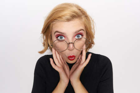 Young black girl surprised by unusual situation. Afro American lady sees something extraordinary. Beautiful woman takes off glasses and looks at camera with shocked face expression