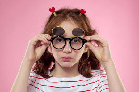 Cheerful girl with pigtails sunglasses striped t-shirt lifestyle pink background