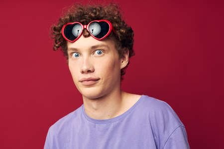 cute red-haired guy guy in a purple t-shirt with sunglasses posing Lifestyle