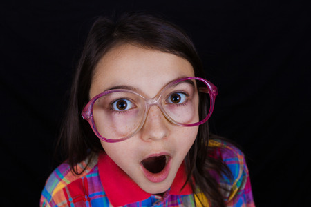 Portrait of surprised child girl wearing looking glasses holding hands to her face isolated on blue background.