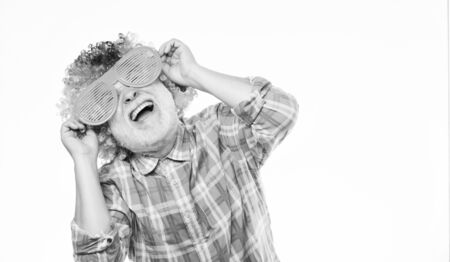 Man senior bearded cheerful person wear colorful wig and sunglasses. Having fun. Funny lifestyle. Fun and entertainment. Comic grandfather concept. Nice joke. Grandpa always fun. Elderly clown.