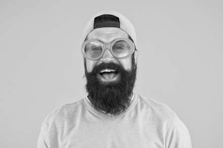 bizarre and strange bearded man with glasses and yellow hat. male face grimace looking at camera.
